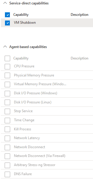 La première opération est le choix d’une cible sur laquelle vont être simulées les pannes. Soit au travers d’un service-direct (sans agent) pour l’ensemble des ressources soit au travers d’un agent pour les ressources de type VM et VMSS (Set de machines virtuelles). Premier point, même si le service-direct est possible sur les VM, ce n’est pas le meilleur choix. Son champ d’action est restreint et présente peu d’intérêt. La liste des possibilités de simulation est bien plus importante avec l’agent comme présenté sur l’écran suivant :