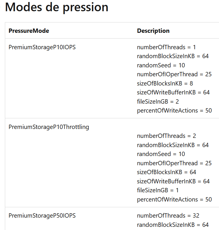 De la performance donc, avec des pics de charge, mais également de la panne. Dans le détail, on voit dans le tableau suivant que les paramètres sont assez fins en termes de valeur. Ici, pour un stress sur différents modèles de disques Azure.
