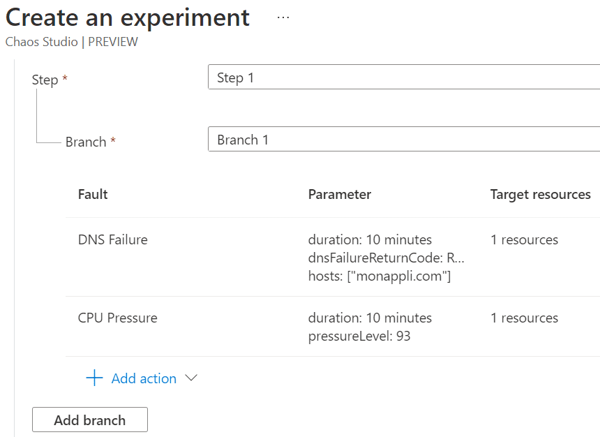 Le studio est ensuite utilisé en mode expérience appelée Chaos Studio | Experiments. C’est ici que vont être empilées les actions. Des pannes ou des délais (Fault ou Delay dans le concepteur).