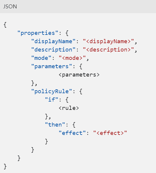 Sans aller trop loin dans le code, dans le fichier Json ci-dessous apparaissent clairement la notion de règle (balise « policyRule ») et la notion d’effet (balise « effect »).