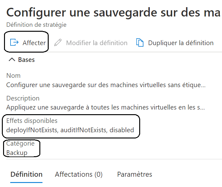 Dans cette console, tout commence par la définition car c’est ici que condition et effet sont choisis. Dans l’exemple suivant, la stratégie se nomme Configurer une sauvegarde sur des machines virtuelles sans étiquette donnée dans un coffre Recovery Services existant dans la même localisation.