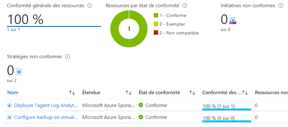 Comme elle est affectée, cette définition est maintenant visible dans la console dans le sous menu Affectations. Au bout de quelques minutes, le temps de la vérification de l’état et des conditions, la stratégie affiche un pourcentage de Conformité. C’est un écran très utile à l’échelle d’une entreprise ou l’on retrouve des dizaines de stratégies avec leur niveau de conformité.