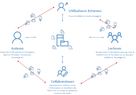 Ceci passe par l’intégration des outils (Exchange, SharePoint, OneDrive, Office, Dynamics), la coédition, la mise en place de niveaux de permissions par utilisateurs ou par groupes d’utilisateur, de versioning, ainsi que la possibilité de gérer le cycle de vie des informations.