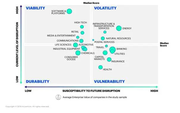 Pas de hasard, l’ « indice de vulnérabilité à la disruption » est bien réel et l’arrivée des nouveaux entrants bouleverse sans cesse la donne. Innovation technologique et changements réglementaires, tout ce qu’il faut décrypter pour être prêt et s’adapter selon le dernier rapport d’Accenture. La disruption semble inévitable mais est-elle prévisible ?