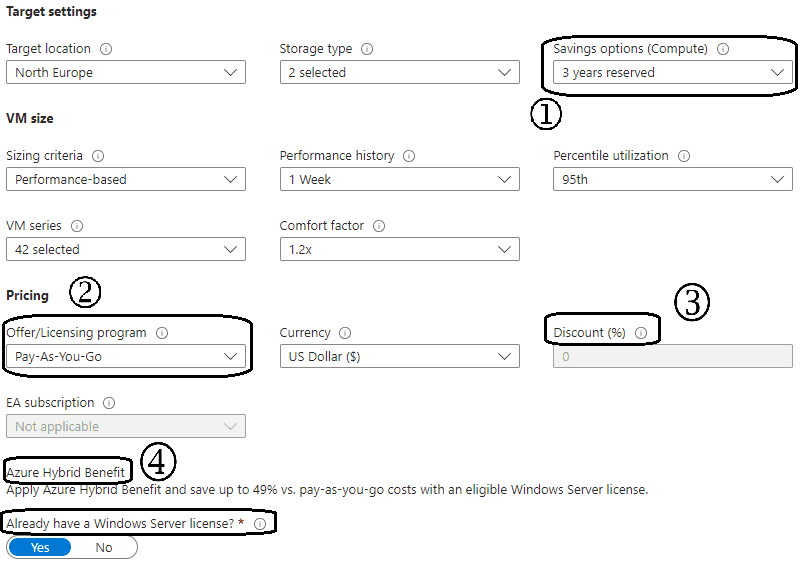 La partie paramètres de l’inventaire a plusieurs options pour affiner la cible. Région de destination ou historique des performances de la machine source pour gagner en précision, c’est-à-dire la possibilité de s’appuyer sur un jeu de données de quelques jours, ce qui augmente la fiabilité de l’inventaire. On trouve aussi des paramètres d’optimisation des coûts avec les options d’utilisation de ses licences ou les réservations (présentés un peu plus bas). Puis un facteur de confort qui simule une augmentation de la charge à venir et va traduire cette donnée pour proposer une machine cible adaptée à cet accroissement futur. Il conviendra de lancer plusieurs fois l’outil avec des paramètres différents pour se faire une très bonne idée de ce que cette bascule On prem => Cloud propose.
