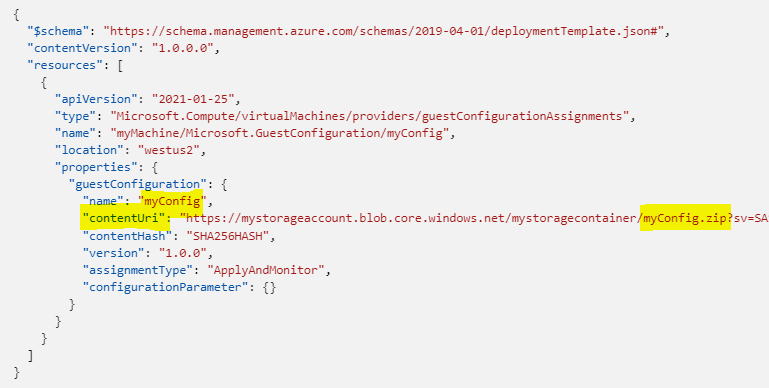 En clair, les points de configuration ne sont pas intégrés dans la stratégie, mais sont référencés dans un emplacement externe, comme un compte de stockage. Ce sont les champs en jaune sur l‘extrait de code ci-dessus.
