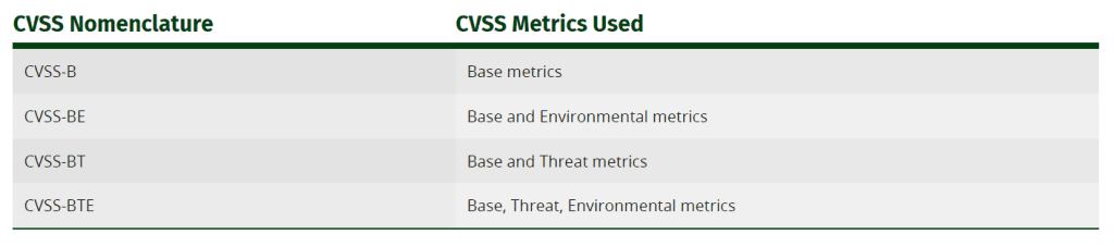 CVSS 4 est constitué maintenant de 4 composants, il a donc fallu revoir la nomenclature des différents ensembles de composants. En effet, si le composant Base est par définition toujours présent, il peut être associé à un ou plusieurs des trois autres composants. Voici la nouvelle nomenclature :
