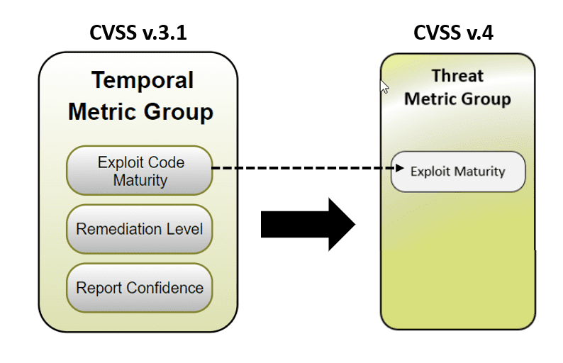 Le composant « Temporal Metric » subit une transformation majeure, il est renommé en « Threat Metric » et deux attributs disparaissent de l’évaluation : « Remediation Level » et « Report Confidence » :