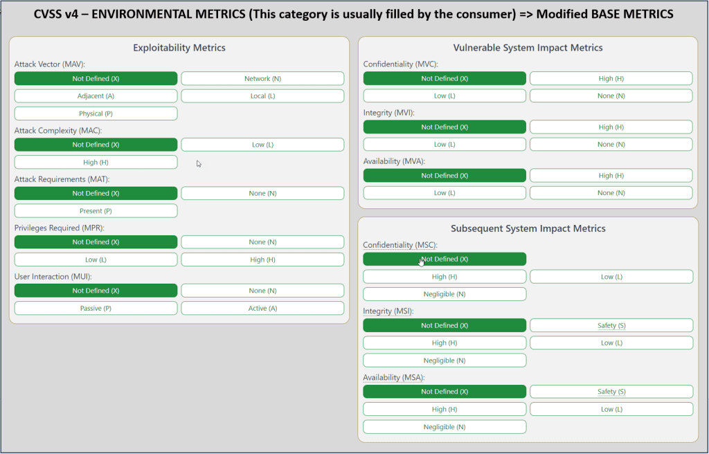 Vous pouvez consulter la version préliminaire de CVSS 4 pour une explication poussée de ces attributs : https://www.first.org/cvss/v4.0/specification-document