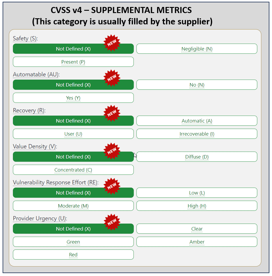 Un nouveau composant optionnel, appelé « Supplemental Metric », fournit une série de nouveaux attributs qui décrivent et mesurent les attributs extrinsèques supplémentaires d’une vulnérabilité. L’utilisation de chaque attribut est déterminée par le consommateur CVSS (l’organisation). Ces informations contextuelles peuvent être utilisées différemment dans l’environnement de chaque utilisateur. Aucun attribut n’aura, dans le cadre de sa spécification, d’impact sur le score CVSS final (par exemple CVSS-B). Les organisations peuvent ensuite attribuer une importance et/ou un impact effectif à chaque attribut, en leur donnant plus ou moins d’effet sur l’analyse de risque finale.
