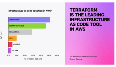 Sur AWS, plus de 71 % des organisations utilisent l’IaC en s’appuyant sur au moins une technologie d’IaC populaire, telle que Terraform, CloudFormation ou Pulumi. Ce chiffre est inférieur à 55% sur Google Cloud.