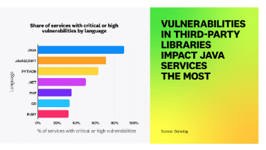 Les applications Java sont les plus impactées par les vulnérabilités tierces : 90 % des services Java sont susceptibles de présenter une ou plusieurs vulnérabilités critiques introduites par une bibliothèque tierce, contre une moyenne de 47 % pour les autres langages de programmation.