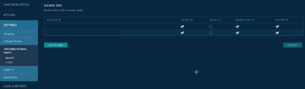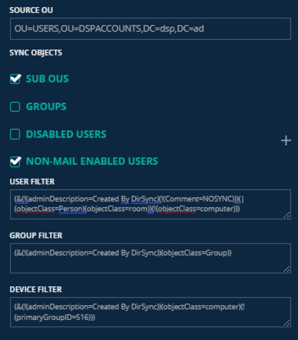 Comme l’outil est facturé à l’identité synchronisée, il serait dommage de synchroniser des identités en trop. Pour ce faire, l’outil permet d’appliquer des filtres LDAP sur les unités organisationnelles sources que vous avez retenues. Ceci permet de filtrer les identités que BTDSP ne prendra pas en compte. La figure suivante illustre la sélection des OU coté source et le filtrage par LDAP.