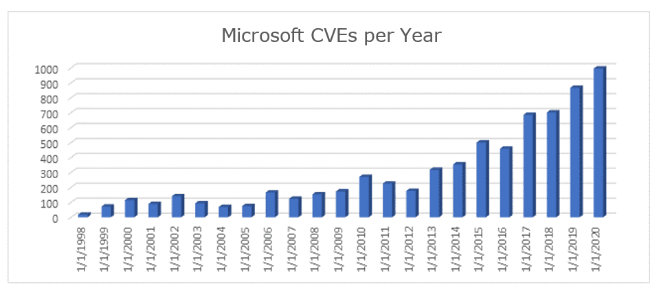 Pour illustrer le deuxième point, le schéma suivant représente le nombre de CVEs identifiées sur les environnements Microsoft, année par année :