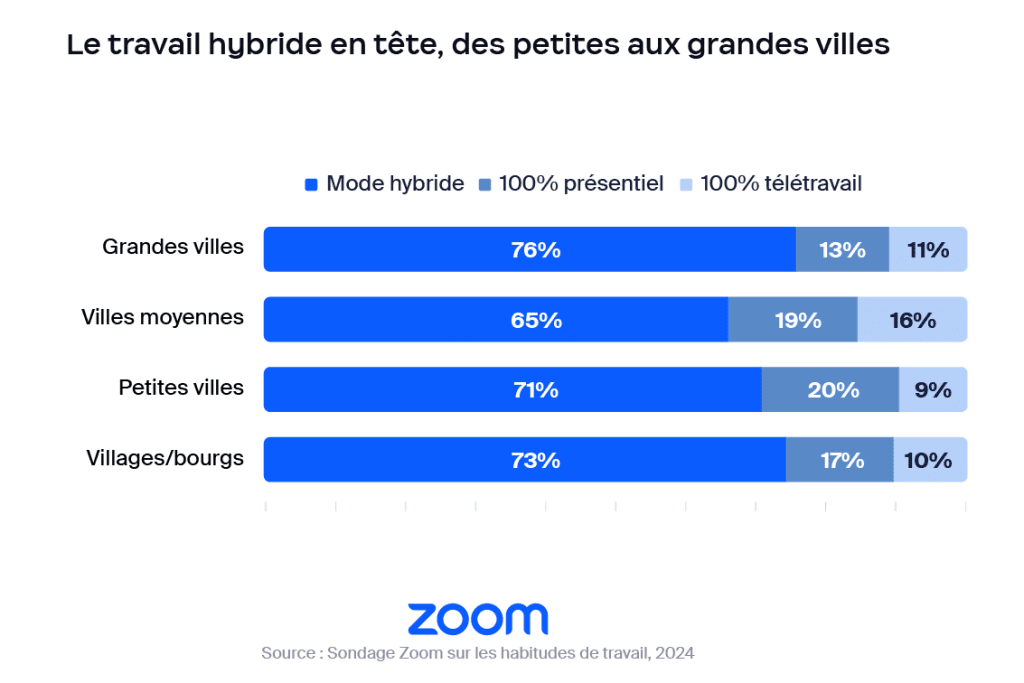 Retour sur les habitude de travail en 2024. 72 % des Français travaillent en mode hybride, 16 % choisissent le 100 % présentiel et 12 % le 100 % distanciel, selon la dernière enquête Zoom France.