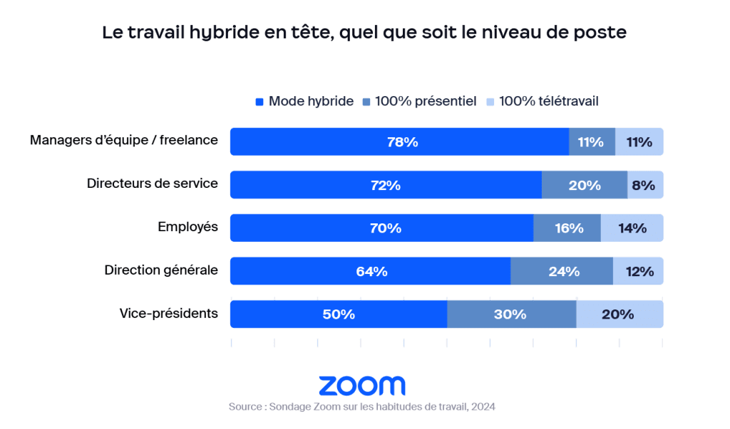 50 % occupant un poste de vice-président sont en travail hybride, 30 % en télétravail et 20 % en présentiel.