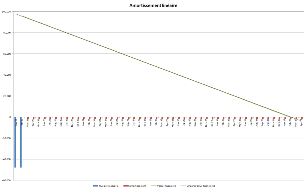 Ainsi, pour prendre un exemple simple, si l’on effectue une dépense d’investissement de 96 000€, un amortissement sur 4 ans sera calculé de la manière suivante : 96 000€ / 48 mois, soit 2 000€ par mois.