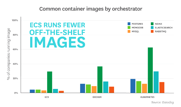 En environnements AWS, les sociétés adoptent Amazon ECS pour gérer leurs conteneurs. En octobre 2017, ECS détenait 34% des parts des environnements Docker dans AWS (27% – janvier 2017).