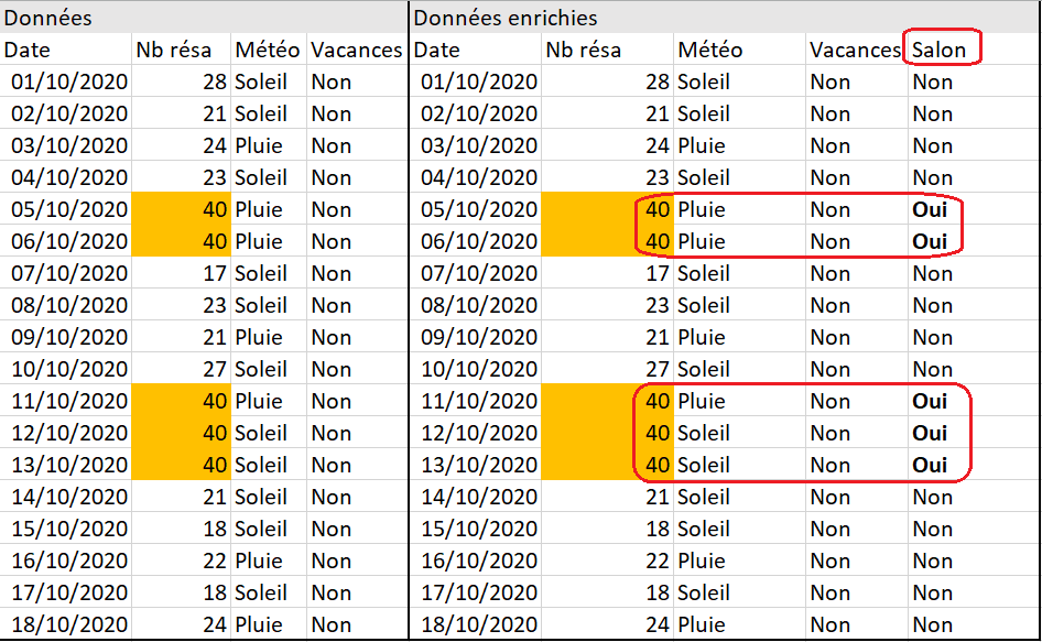 …A la réflexion, il y a certainement un lien avec les salons professionnels qui se tiennent régulièrement à quelques kilomètres de mon hôtel. Je vais enrichir mes données d’historique. Date, Nombre de réservations, Météo, Vacances deviennent Date, Nb résa, Météo, Vacances, Salon.