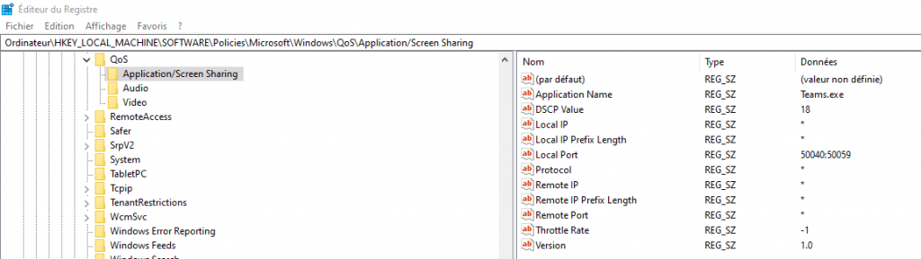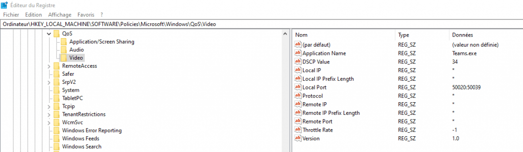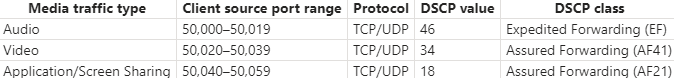 Dans le cadre de Teams , les données voix seront marquées avec la valeur DSCP 46 , les données Vidéo avec la valeur 34 et le partage d’application avec la valeur 18