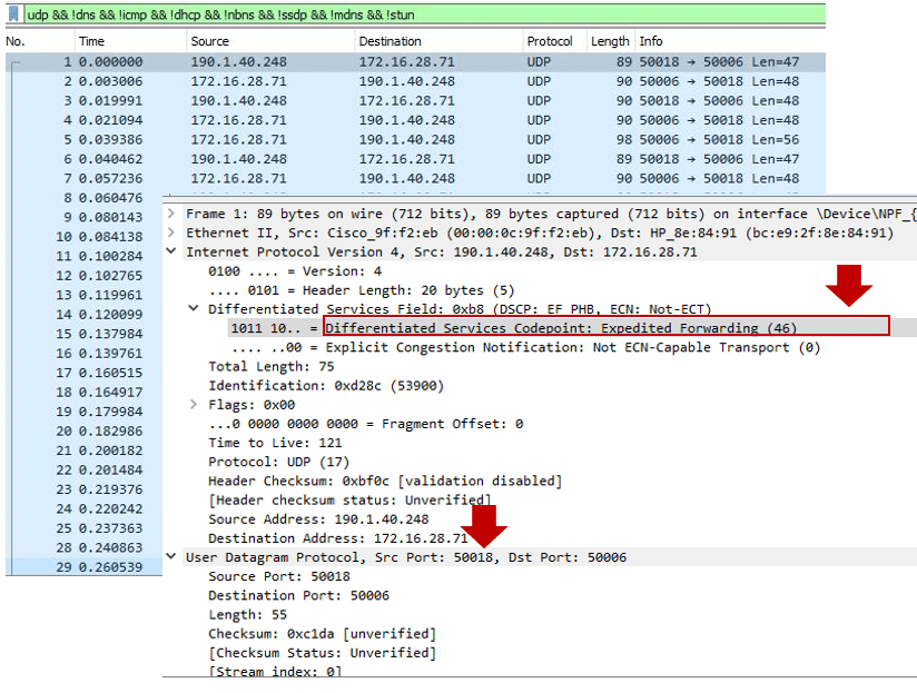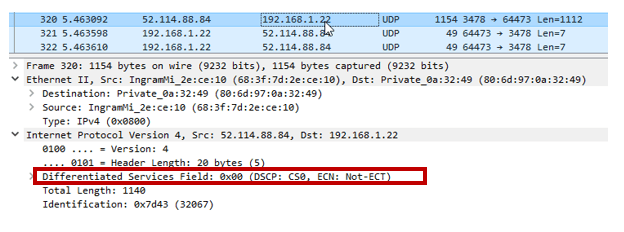 Une fois que vous avez mis en place ces paramètres, il faut vérifier que le client Teams marque correctement les paquets en fonctions de différents protocoles. Pour cela, il faut utiliser WireShark pour capturer les flux envoyés par votre client Teams et vérifier la présence du DSCP.