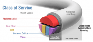 - Expedited Forwarding : L’IETF définit le comportement d’Expedited Forwarding (EF) dans la RFC 3246. Elle présente les caractéristiques suivantes : faible retard, faible perte et faible gigue. Ces caractéristiques sont adaptées à la voix, à la vidéo et à d’autres services en temps réel. Le trafic EF bénéficie souvent d’une mise en file d’attente strictement prioritaire par rapport à toutes les autres classes de trafic.