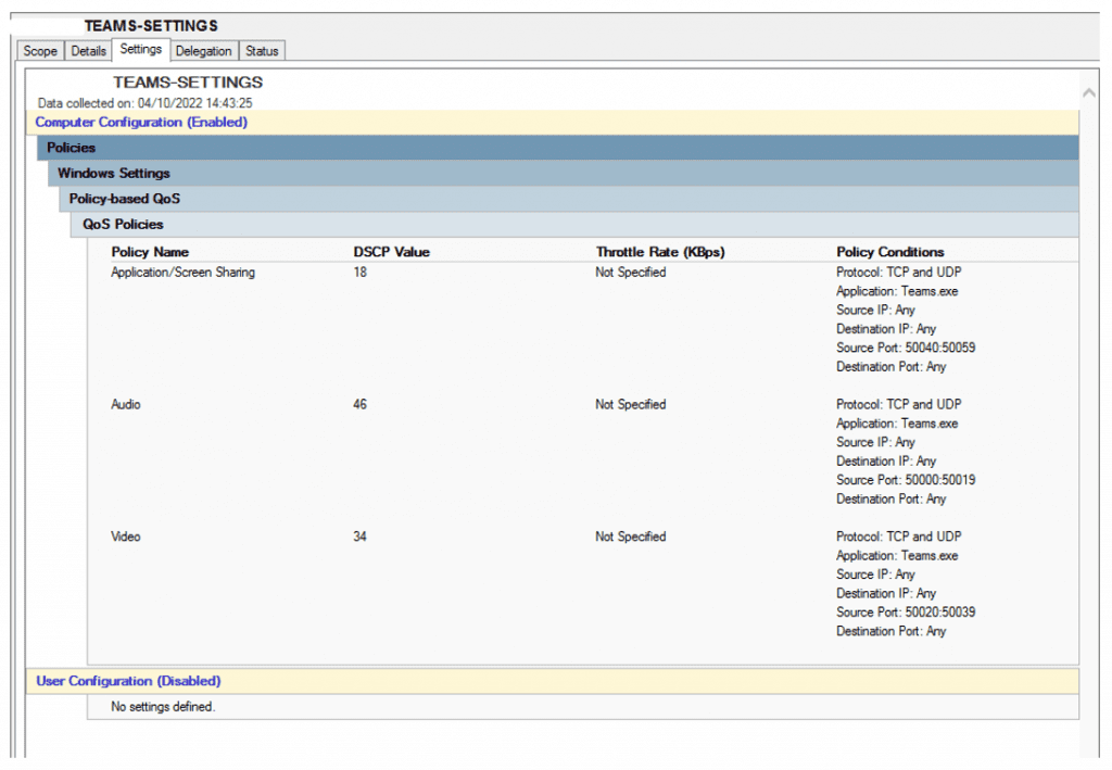 new-NetQosPolicy -Name « Teams Audio » -AppPathNameMatchCondition « Teams.exe » -IPProtocolMatchCondition Both -IPSrcPortStartMatchCondition 50000 -IPSrcPortEndMatchCondition 50019 -DSCPAction 46 -NetworkProfile All
