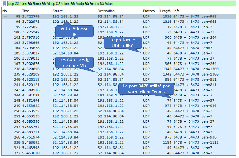 ce qui vous donnera ensuite à peu de chose près le résultat suivant. On notera dans la figure ci-dessous que les flux utilisés sont basés sur le port 3478 en Udp ce qui prouve que la GPO n’est pas présente sur le poste