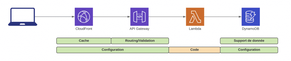 Chez un cloud provider comme AWS, on utilisera par exemple CloudFront pour porter les certificats HTTPS d’une application web, et gérer le cache. Ce dernier sera configuré pour transférer les requêtes HTTP faites à CloudFront vers API Gateway, services de routing, de validation et d’autorisation si utilisé conjointement avec Cognito. Enfin, une Lambda contenant la logique métier propre à l’application sera invoquée par API Gateway, elle-même se reposant par exemple sur DynamoDB comme base de données.