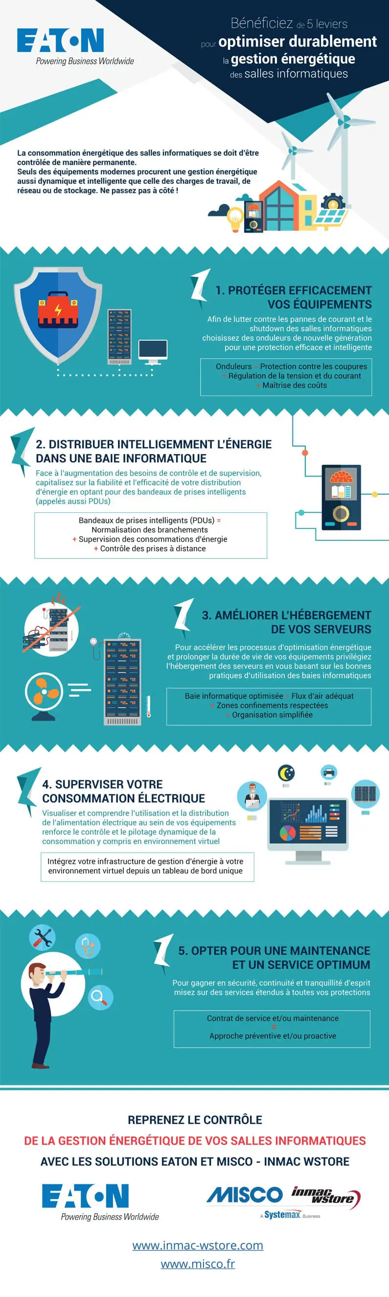 Découvrez, dans cette infographie, quelles sont les 5 clés technologiques qui permettent d’optimiser la consommation électrique des salles informatiques.