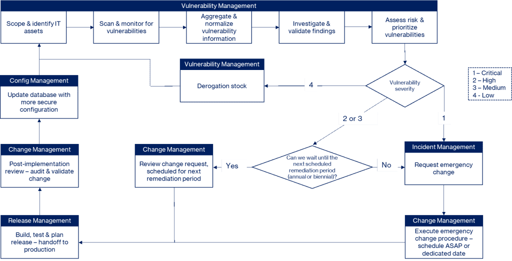 - Finalement, quand les règles de priorisation seront établies et permettront de définir clairement ce qu’il faut corriger et à quelle échéance, le VOC devra synchroniser les actions entre l’équipe sécurité et les équipes en charge de la remédiation (souvent les équipes systèmes ou applicatives)