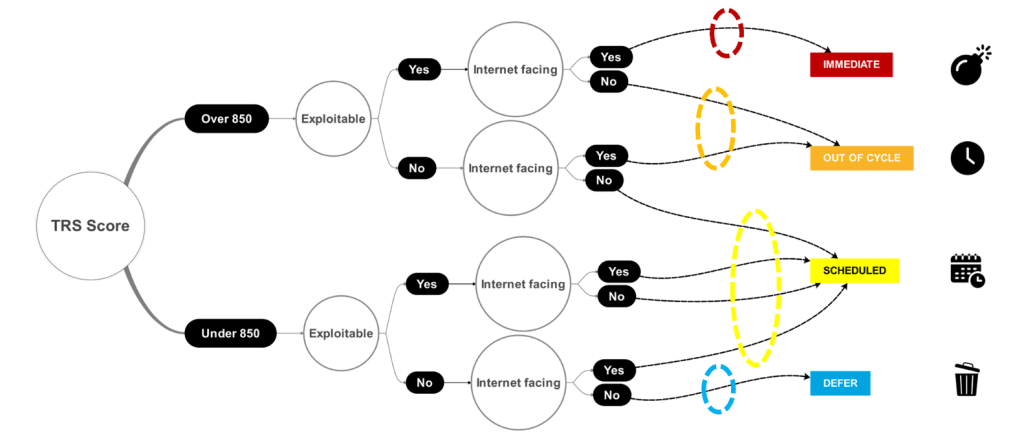 Important : Les arbres peuvent évoluer avec le temps, en effet, il est envisageable que la première version de votre arbre de décision attribuera trop de findings dans le pool IMMEDIATE, et vos équipes de production ne pourront pas suivre. Il faudra alors adapter votre arbre pour qu’il soit compatible avec vos capacités de remédiation réelles et pas avec vos envies… Il est très important que les temporalités associées aux différents pools soient réalistes.